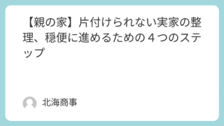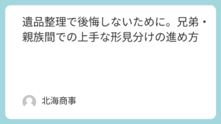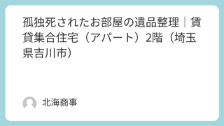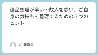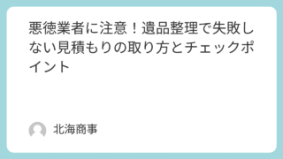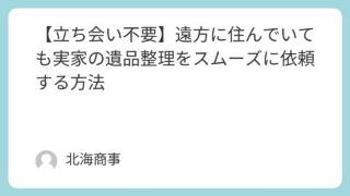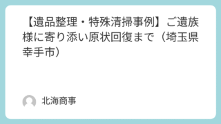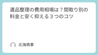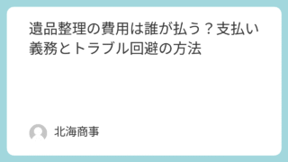 遺品整理やご実家の片付けは、私たち北海商事にお任せください。「一般財団法人 遺品整理士認定協会」の認定を受けた専門の遺品整理士が、ご遺族様の心に寄り添い、真心を込めてお手伝いします。お部屋の片付けや生前整理、空き家やゴミ屋敷の整理はもちろん特殊清掃まで、どんなお悩みでもお気軽にご相談ください。