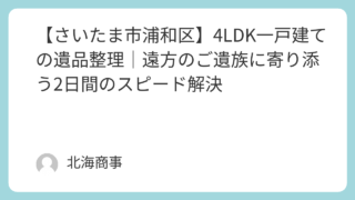 私たち北海商事は、地元・埼玉県を中心に、お客様一人ひとりのお悩みに寄り添う地域密着のサービスを提供しております。「遠方に住んでいる実家の片付け」など、エリアをまたぐご依頼にも数多く対応してまいりました。どの地域でも、変わらぬ品質と心に寄り添う丁寧な作業をお約束します。